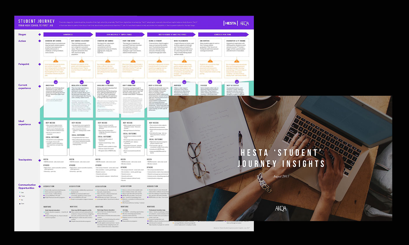 At AKQA, I completed a design research project to help Hesta identify opportunities to reach students as they progressed across their study, first job and university journeys. I synthesised research interviews, produced a student journey map and an insight report and presented insights to the client.